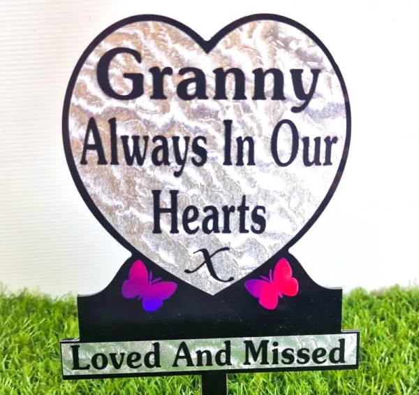 – Personalised design inspired by: Granny Heart Shaped Memorial Plaque Tribute Light Refractive Purple Butterfly