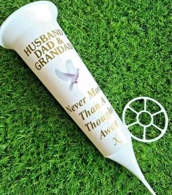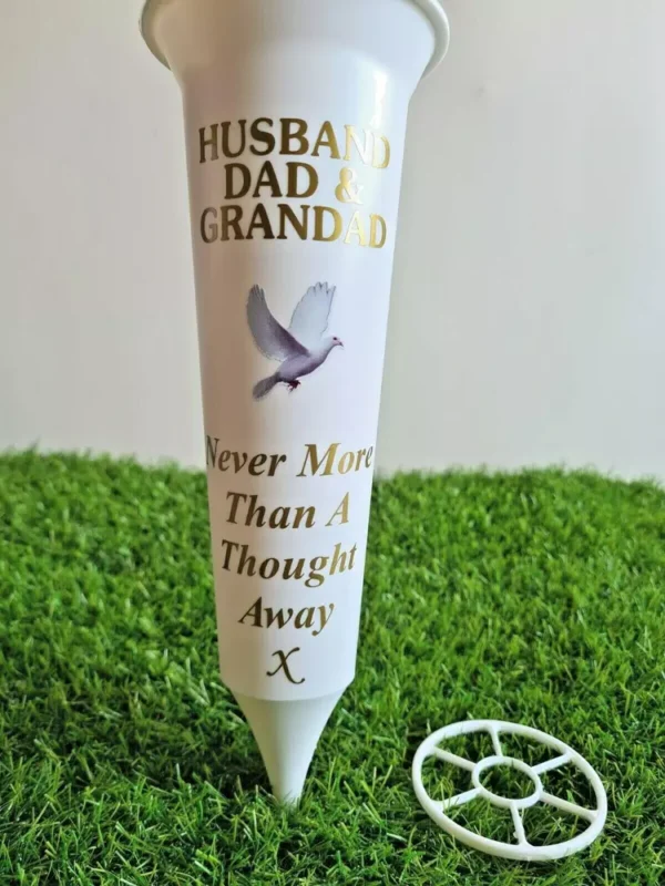 – Personalised design inspired by: Husband Dad & Grandad White Memorial Gift Flower Grave Spike Vase with Dove
