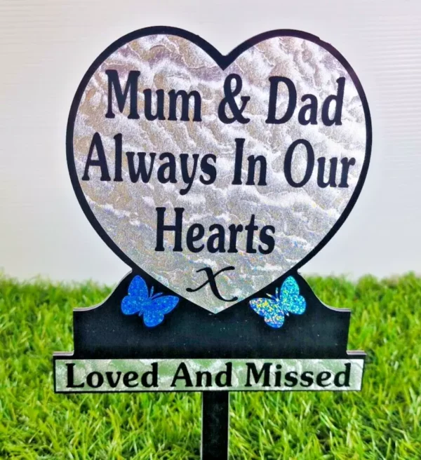 Mum and Dad Heart Shaped Memorial Plaque Grave Tribute Blue Sparkle Butterfly.k