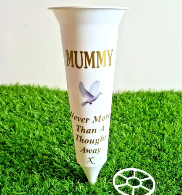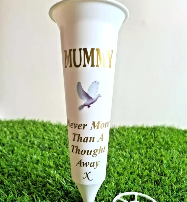 – Personalised design inspired by: Mummy White Memorial Gift Flower Vase Grave Spike with Dove Graveyard Decoration